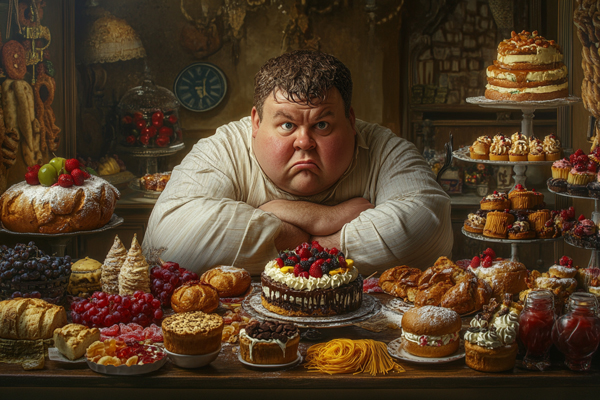 fat man sitting at a table with sugary foods.